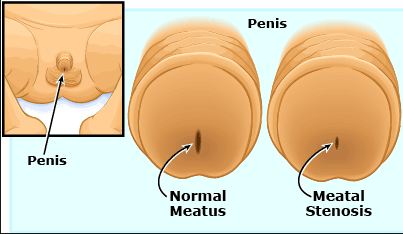 در صورتیکه قطر مجرای ادراری از حد معمول کمتر باشد، تنگی مجرای ادراری ( تنگی مه آ)گفته میشود که میتواند مادرزادی یا اکتسابی باشد